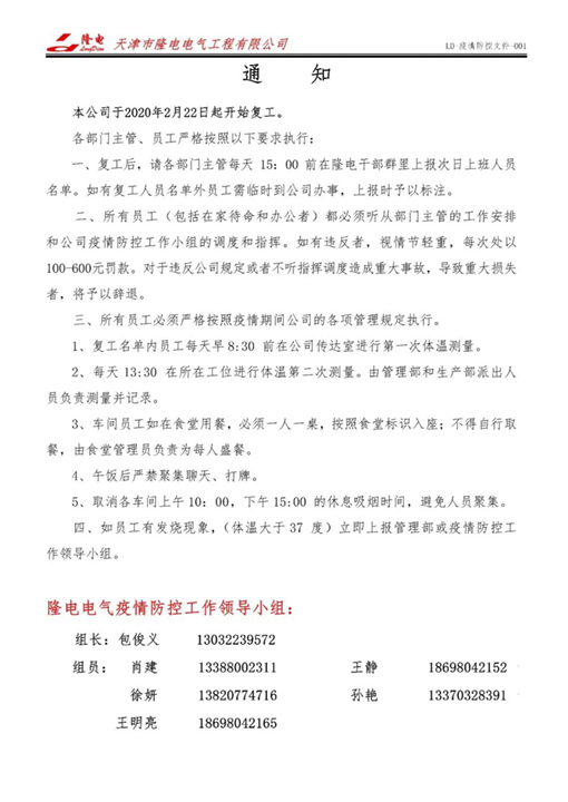 隆電電氣于2020年2月22日起開始復工,具體通知如下: